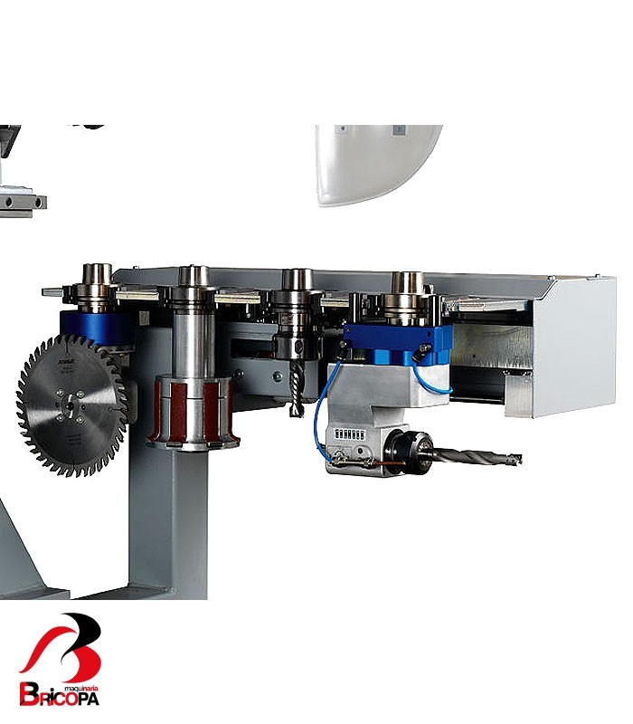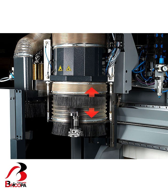 The main spindle: With a motor power of 12 to 15 kW with up to 24.000 rpm and inverter controlled, the main spindle motor is more than capable to tackle any task. The motor is fixed directly on to the carrier unit in the Z-axis. The highly precise vertical guiding of the moulder motor is guaranteed by two vertical guide tracks. The HSK F63 tool clamping is carried out automatically. The clamping pressure of the tool is controlled by sensors and the operation safety guaranteed. The tooling housing is cleaned pneumatically.