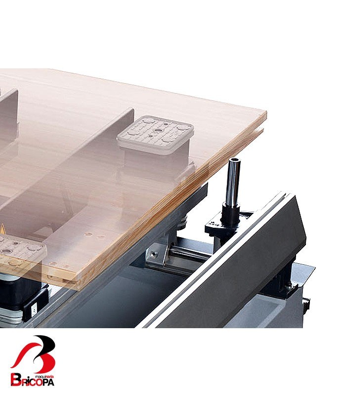 Workpiece stops for veneered panels: In addition to the standard workpiece cylinder stops, there are additional stops specifically developed to machine veneered panels with projecting veneer or laminate.