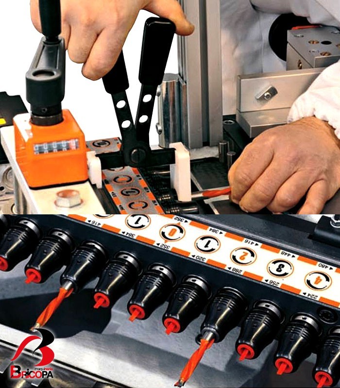 Head with 23 spindles, 32 mm system with quick change chucks. The useful space between the head and the working table allows easy access of the operator for tools change.