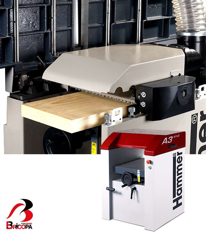 PLANER THICKNESSER A3 41D HAMMER thicknessing width 406 mm, 3-knife quick-change self-setting cutterblock system, thicknessing height 225 mm, synchronised feed speed 6 m/min. OPTIONAL spiral cutterblock Silent-POWER®