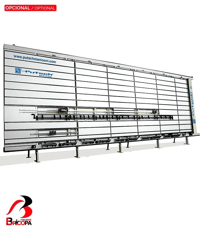 Dispone de apoyos de piezas inferiores en aluminio con ruedas retractiles para desplazar los paneles. Desplazamiento automático del carro y del grupo sierra para los cortes horizontales y verticales; estos últimos están asegurados en 6 puntos de frenado fijo arriba y abajo del bastidor.