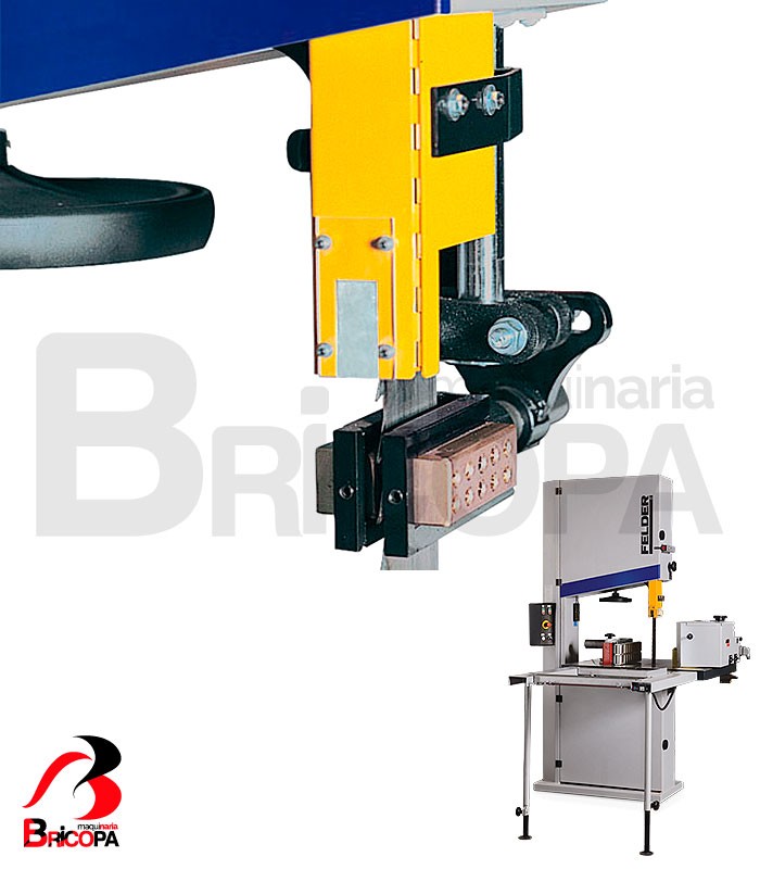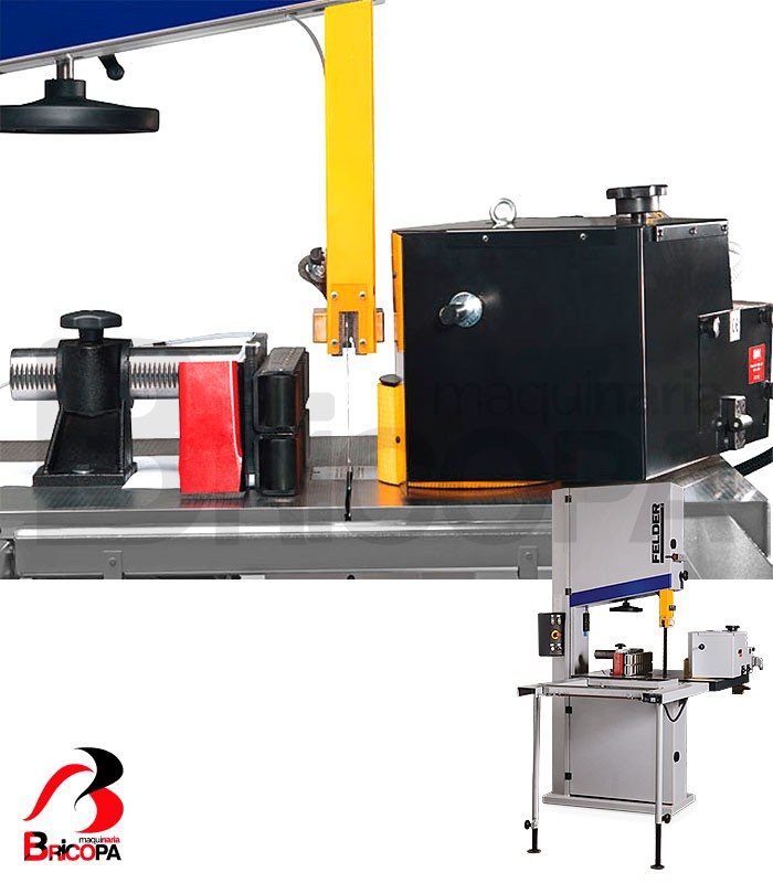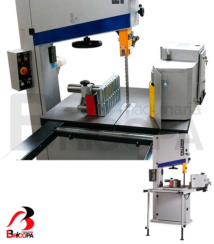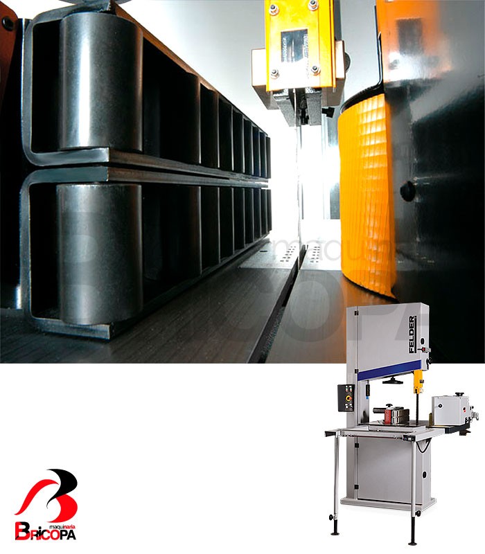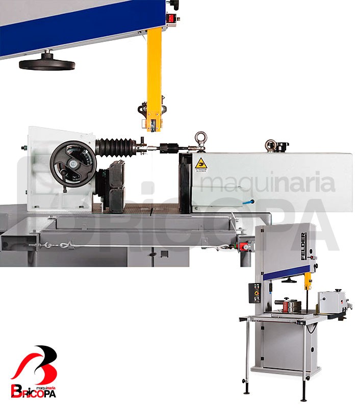 La SIERRA DE CINTA FB 940 RS FELDER tiene una altura de corte de 550mm, un ancho de corte de 910mm y un volante de 940mm diámetro. La velocidad de corte es de 1950 m/min. Las dimensiones de la mesa son 860 x 1100mm. Cuenta con abertura del alimentador con balanceo neumático, opcional.