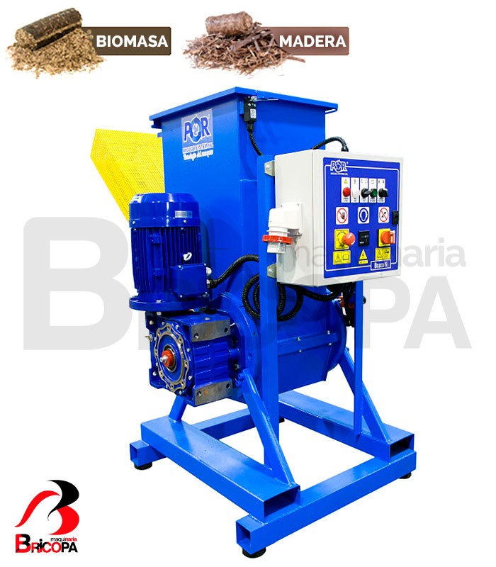 La TRITURADORA BRUCO POR está indicada para residuos de madera y biomasa. Tiene un motor de 10 HP, empujador neumático, apertura de carga 420x540mm y bastidor electromecánico. Tolva de puerta con sensor de seguridad.