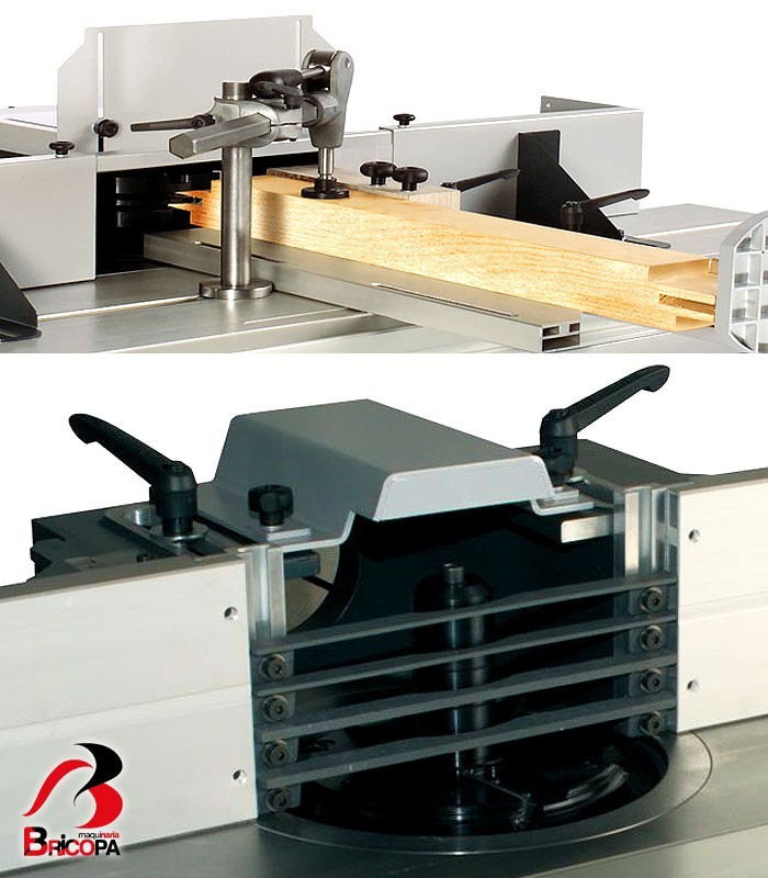 TUPI F 900 Z FELDER: Orificio de la mesa p. herram. en mm 320, ajuste de altura eléctrico para el eje de tupí, indicador LED para altura, inclinación manual eje tupí 90°–45°, eje Ø 30 mm, altura útil 140 mm, carro espigar 1300 mm