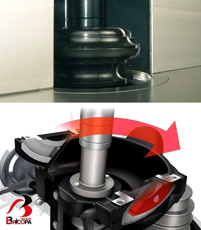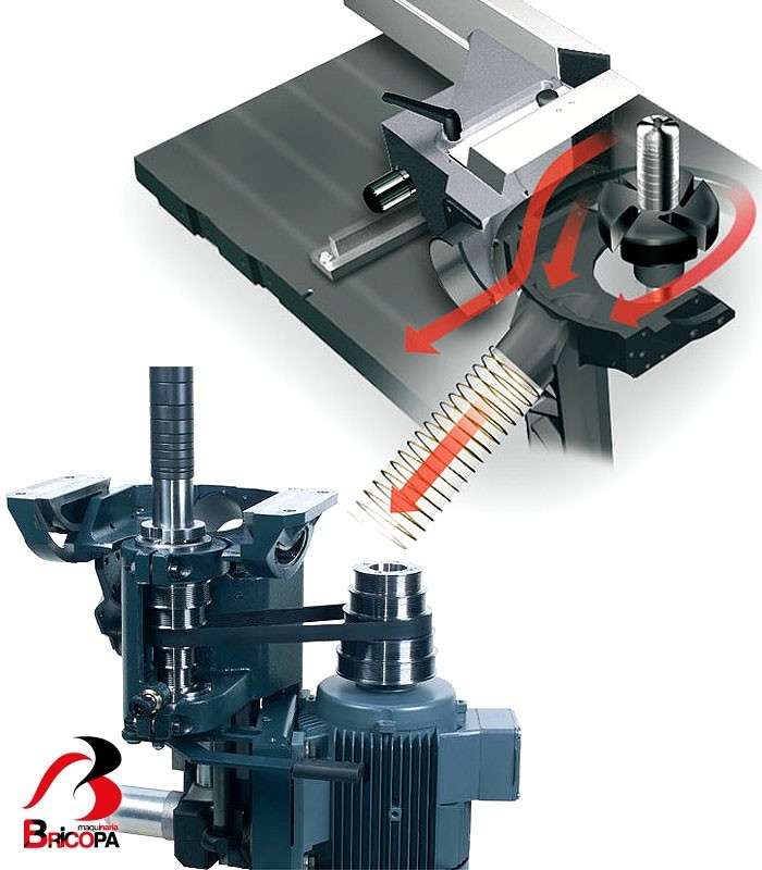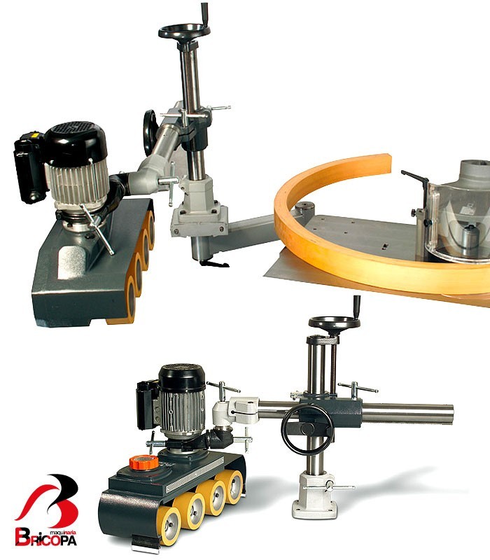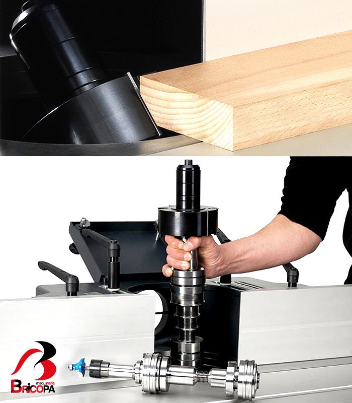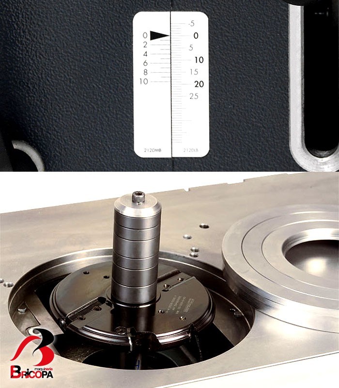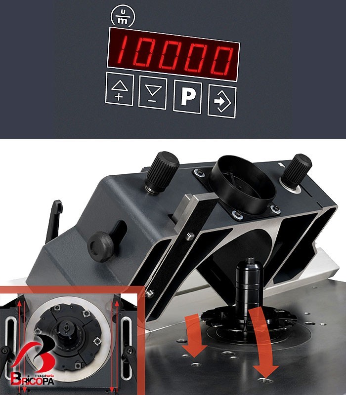 Botón giratorio para la altura útil e inclinación de la unidad del eje de tupí, ajustes rápidos y precisos. La unidad de visualización (display) le indica el valor real de la altura y del ángulo del eje de tupí.